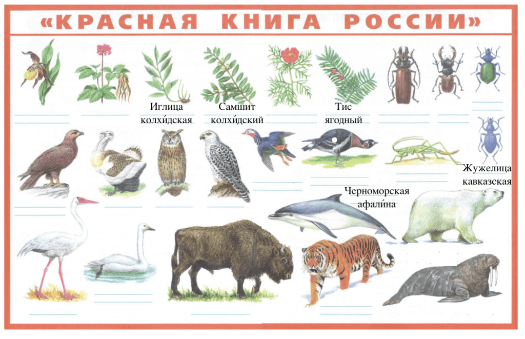 Продолжи заполнение плаката «Красная книга России», который нарисовал папа Сережи и Нади. Найди на плакате растения и животных Черного моря и его берегов. Подпиши их названия.