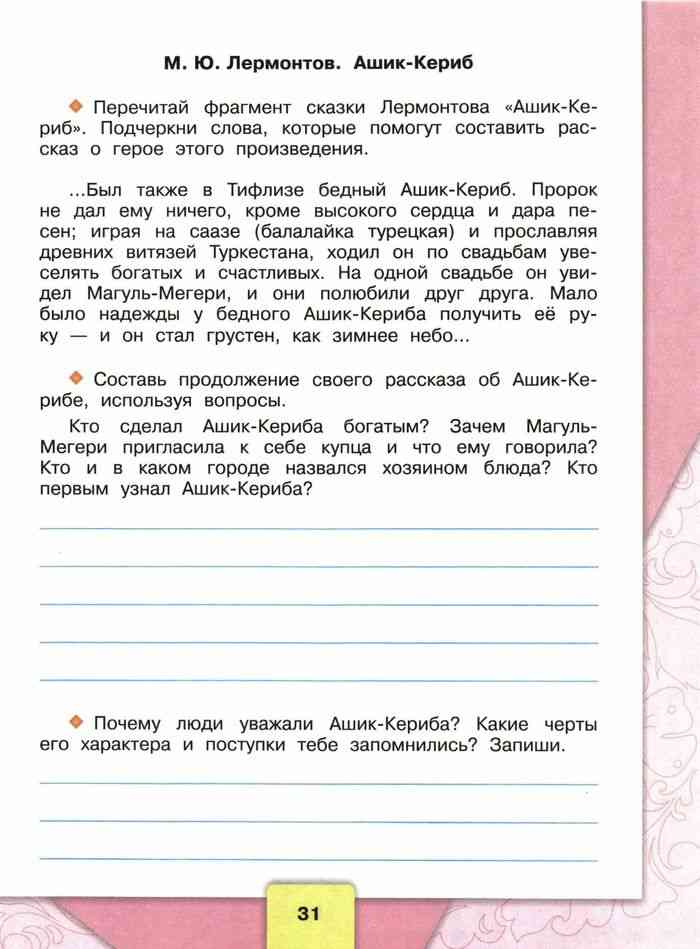 • Перечитай фрагмент сказки Лермонтова «Ашик-Кериб». Подчеркни слова, которые помогут составить рассказ о герое этого произведения.