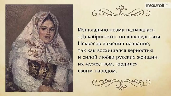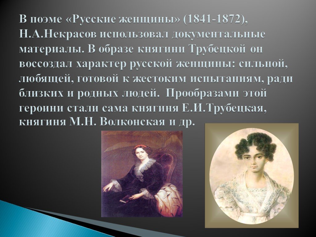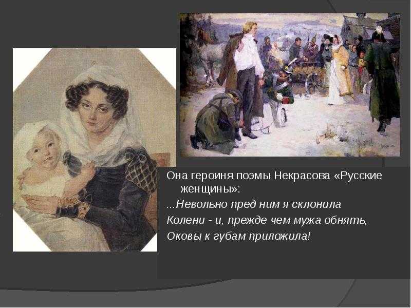 Воссоздавая в поэме жизненный подвиг Екатерины Ивановны Трубецкой и Марии Николаевны Волконской, Некрасов открывал новые грани национального женского характера.