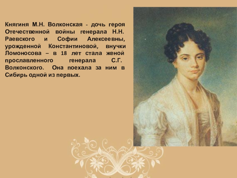 Вторая часть поэмы о Марии Николаевне, княгини Волконской, в девичестве – Раевской. Родилась под Киевом. Отец, генерал Раевский, прошёл войну с Наполеоном, был заслуженным и почитаемым человеком.
