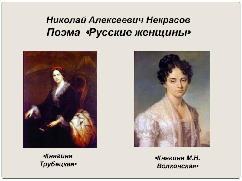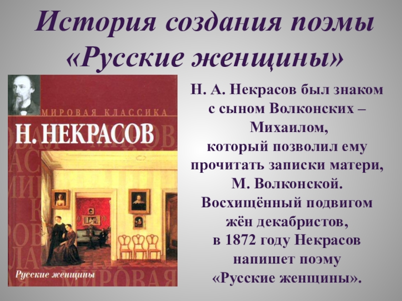 Поэма Н.А.Некрасова «Русские женщины» (1871— 1872) — поэма о женах декабристов, участников восстания на Сенатской площади Петербурга в 1825 году.