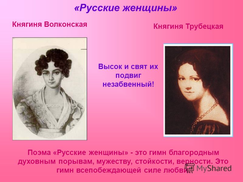 Подвиг русской женщины и верности своему долгу — быть поддержкой мужу в любых обстоятельствах. Через образы княгинь, Трубецкой и Волконской, Некрасов показал духовную силу русской женщины.