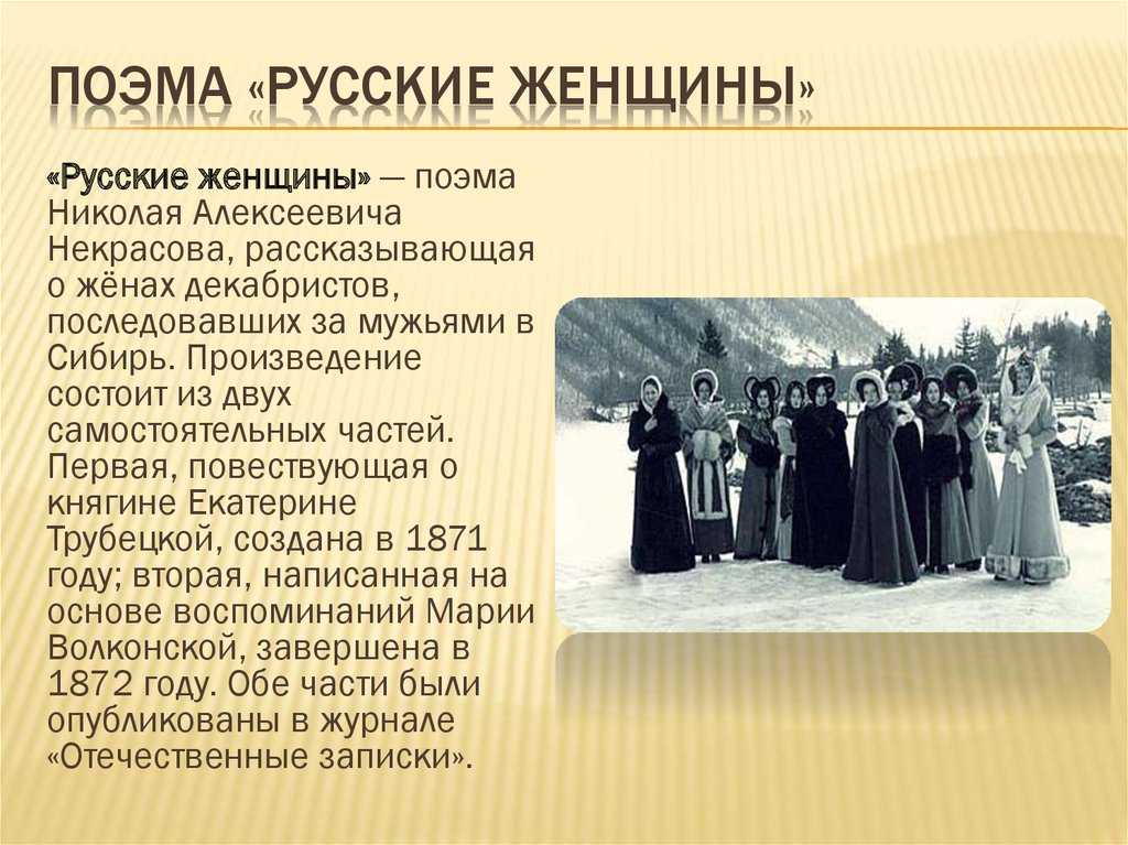 Некрасов рассказал в своей поэме трагическую судьбу русских дворянок, преданных своему супружескому долгу, которые добровольно отреклись от обеспеченной жизни, обрекли себя на голод и нищету, последовав за своими мужьями в ссылку.