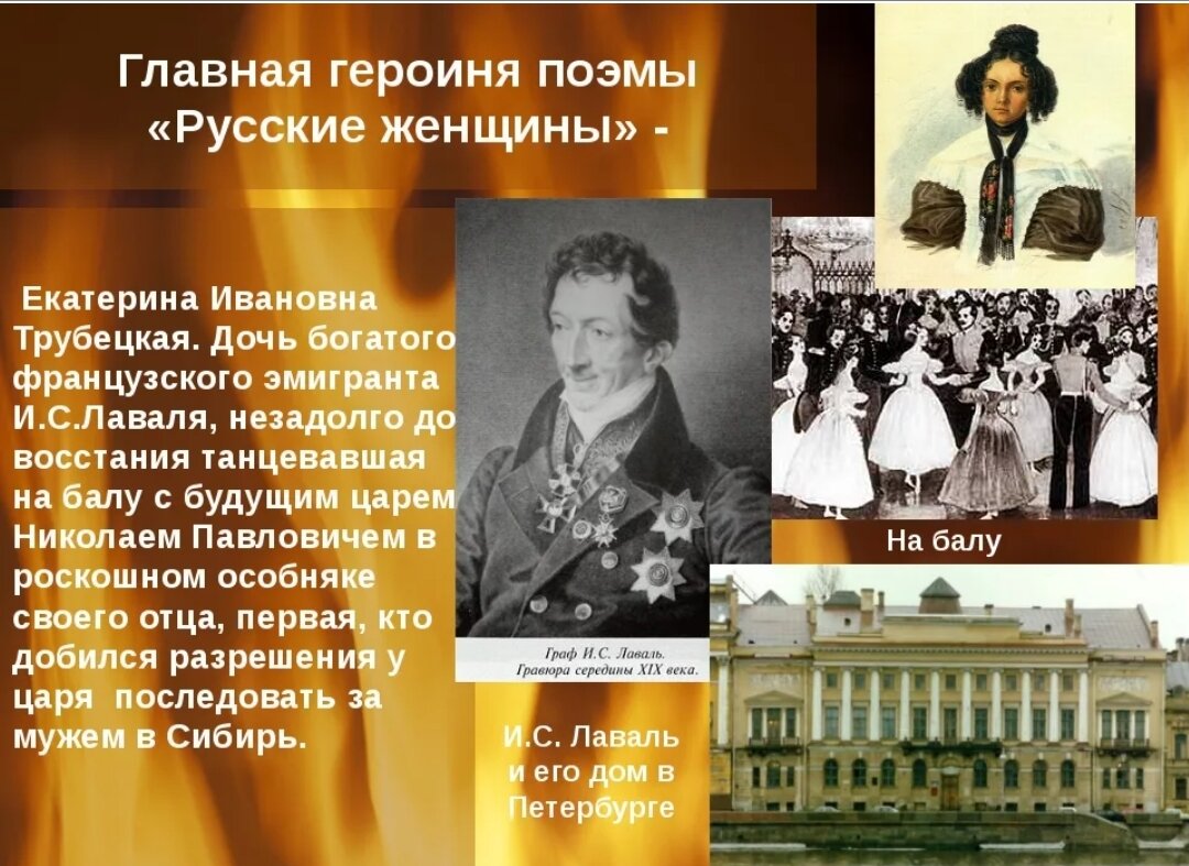 Екатерина Ивановна Лаваль вышла замуж за Сергея Трубецкого по любви. Она стала его верным другом и единомышленником, была в курсе политических взглядов мужа. Узнав о событиях на двадцатипятилетняя Екатерина сразу же для себя решила, что разделит с мужем его участь, какой бы страшной она ни была. Княгиня стала первой из одиннадцати женщин, отправившихся вслед за приговор огласили 23 июля, а уже на следующий день она отправилась в дорогу. Ее сопровождал секретарь отца Карл Воше (по пути он заболеет и вернется назад, о чем пишет в поэме Некрасов). «Русские женщины» — это поэма, рассказывающая о нелегком путешествии от Петербурга до Иркутска, показывающая стойкость, терпимость героини, ее преданность мужу и готовность к самопожертвованию.