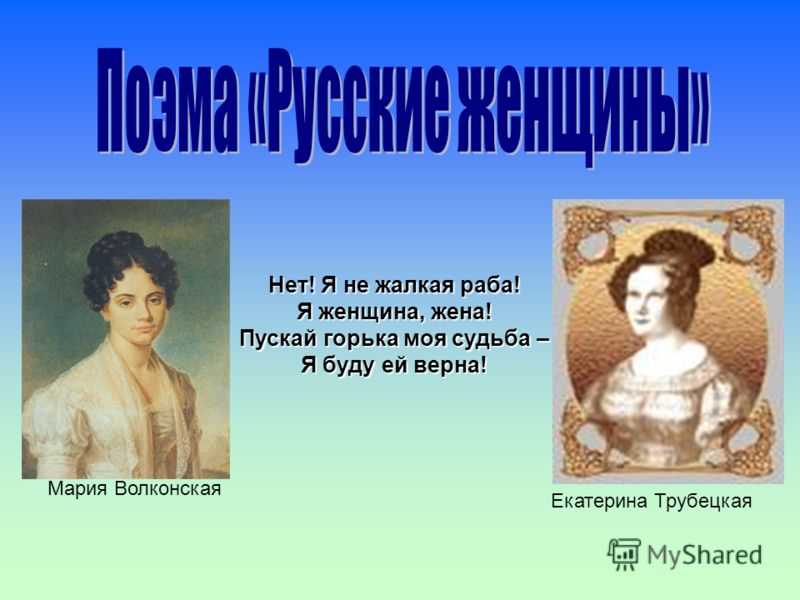 Поэма о величии русской женщины. Автор хотел сказать, что такие подвиги самоотверженности, любви, терпения и веры присущи не только дворянкам, декабристкам, но и русским женщинам вообще. Обе героини меняют роскошную жизнь на жизнь изгнанников, каторжников. Обе верят в правоту мужей, в благородство их поступков. Поэма учит быть верным, благодарным, любящим, учит не сдаваться, приходить на выручку к тем, кому тяжело, честно исполнять свой долг, с терпением переносить трудности, верить в близких людей и их идеалы, беречь семью.