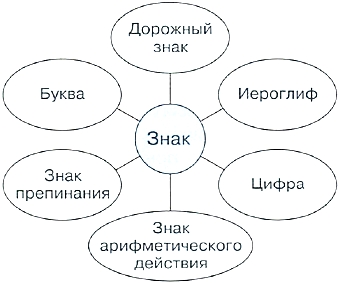 «Знак» — это родовое понятие для видовых понятий «буква», «цифра», «знак препинания» и других.