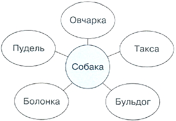 «Собака» — это обобщающее, то есть родовое понятие. Оно включает в себя другие понятия: «овчарка», «такса», «бульдог», «болонка», «пудель». Названия пород — это слова, обозначающие видовые понятия.