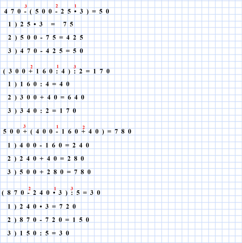 Рассмотри выражения в каждой рамке. Объясни порядок выполнения действий, указанных синими цифрами.