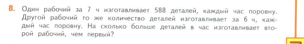 Один рабочий за 7 ч изготавливает 588 деталей, каждый час поровну. Другой рабочий то же количество деталей изготавливает за 6 ч, каждый час поровну. На сколько больше деталей в час изготавливает второй рабочий, чем первый?