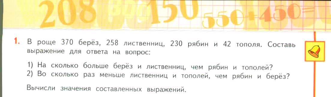 В роще 370 берез, 258 лиственниц, 230 рябин и 42 тополя. Составь выражение для ответа на вопрос: