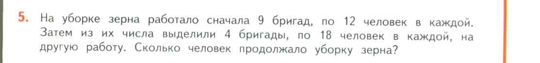 На уборке зерна работало сначала 9 бригад, по 12 человек в каждой. Затем из их числа выделили 4 бригады, по 18 человек в каждой, на другую работу. Сколько человек продолжало уборку зерна?