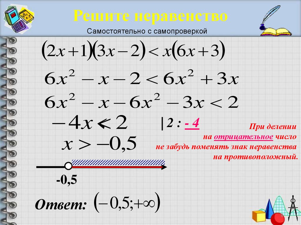 Решаем обычные линейные неравенства: все, что с иксами переносим в левую сторону, все что без иксов — в правую. |