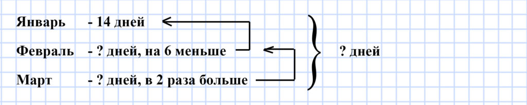 В январе было 14 солнечных дней, в феврале − на 6 дней меньше, чем в январе, а в марте − в 2 раза больше, чем в феврале. Поставь вопрос и реши задачу.