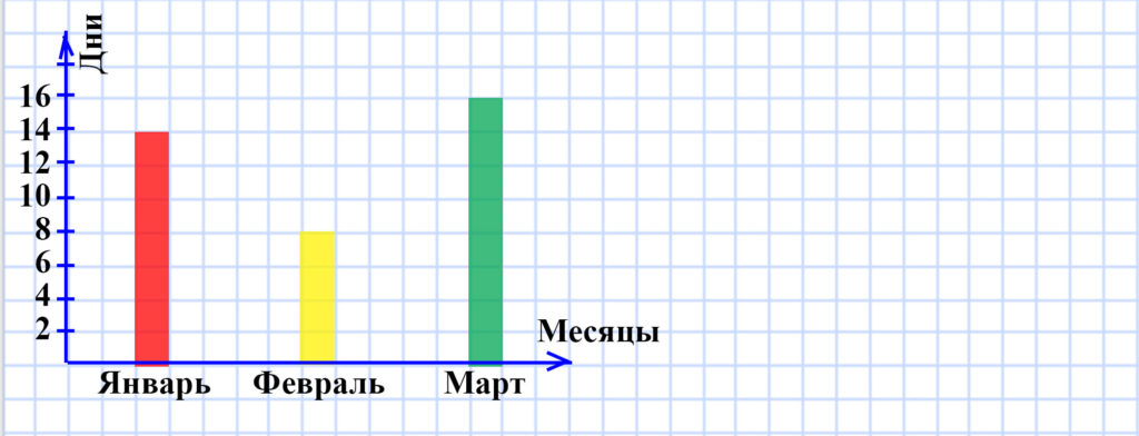 114. Построй диаграмму количества солнечных дней по месяцам, используя решение задачи 113. (Обозначай 2 дня одной клеткой.)