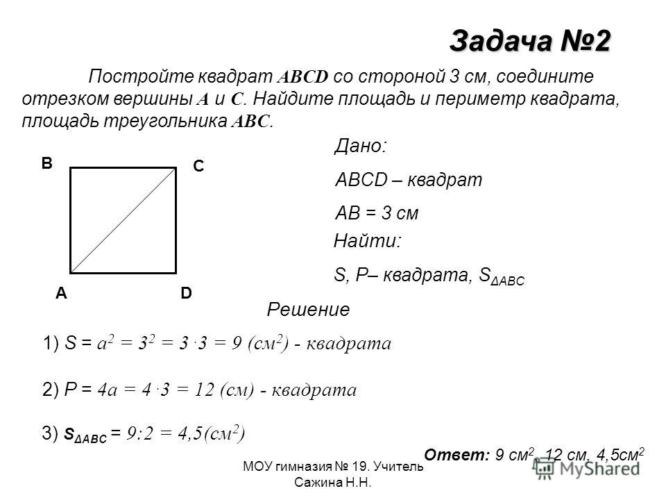 2) Найди периметр и площадь квадрата ABCD.